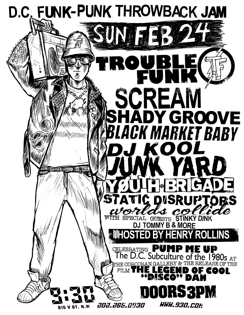 Celebrating the PUMP ME UP: The DC Subculture of the 1980s exhibit at the Corcoran Gallery and the release of the film THE LEGEND OF COOL "DISCO" DAN, the D.C. Funk Punk Throwback Jam was a concert event held on February 24, 2013, at the legendary Club 930. In the spirit of the 1980s' thriving music scene in D.C., the show paid tribute to the 1983 Funk Punk show, the last Minor Threat show where they opened for Go-Go legends Trouble Funk. Roger Gastman, Joseph Pattisall, Iley Brown, and the 930 Club organized the sold-out event and enlisted several bands to revive the memories and melodies of the local Go-Go and hardcore scenes. Trouble Funk, Scream, Junkyard, Static Disruptors, Youth Brigade, DJ Kool, Black Market Baby, Shady Groove, Worlds Collide (with special guest Stinky Dink), DJ Tommy B, DJ Scorpio, and others played a nostalgic night of music, hosted by D.C. native Henry Rollins.